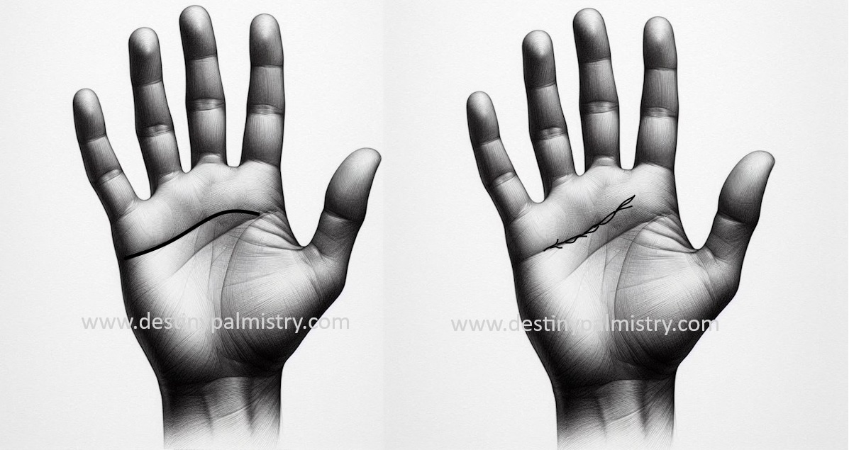 The head line shows how we think. So, if there are breaks on the line on the non-dominant hand, the person might feel like they can’t focus. It might also suggest an indecisive nature. If the dominant hand has a regular line, it doesn’t affect the person.